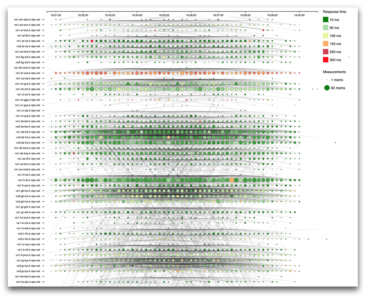 Once we have measurable and willing targets, the measuring fun begins! The anchor hosts get, free of charge, a number of benefits: the system puts all of them in a measurement mesh, meaning every anchor measures the connectivity to every other anchor. Each anchor is also targeted by a few hundred regular probes so there’s a view from the edge of the network too. By the way, trivia question: did you know why they are called anchors? Perhaps now you can guess… because they act as stable anchoring points for probes. Their “movement” inside the topology can be observed and accurately mapped by looking at the measurements against them.